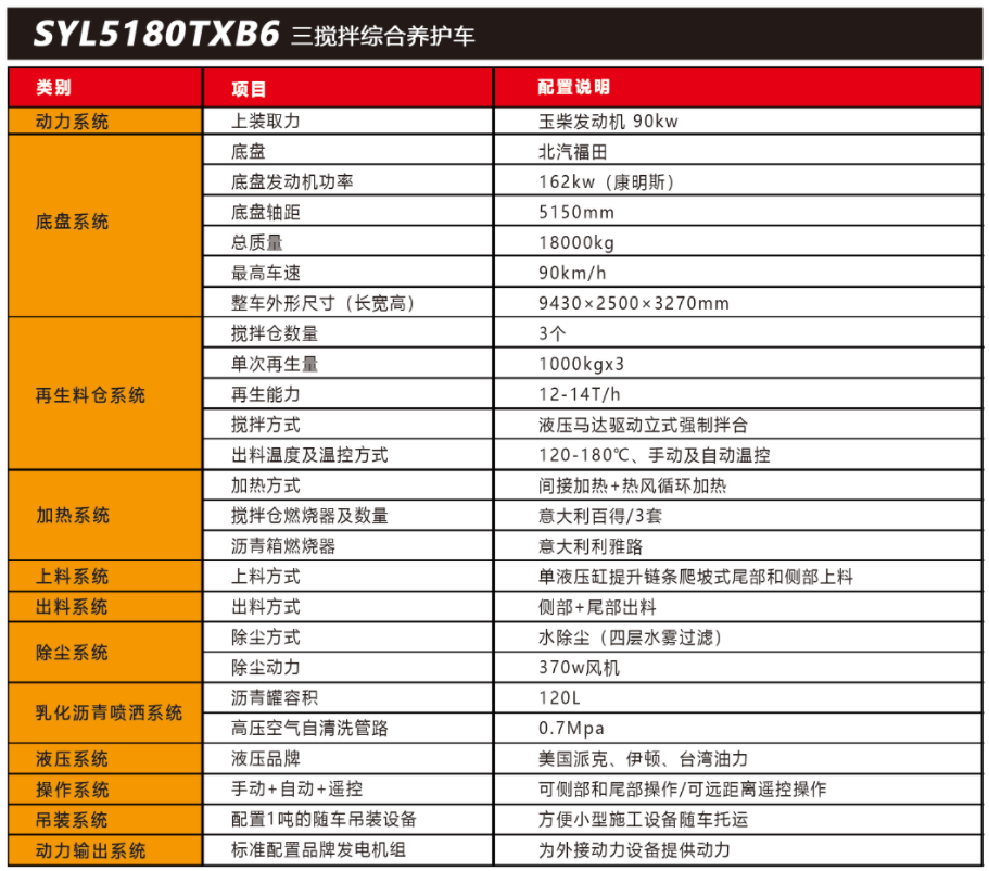 SYL5180TXB6 三攪拌路面綜合養(yǎng)護(hù)車是一款集現(xiàn)場生產(chǎn)新瀝青混合料、瀝青路面冷 料、舊料、銑刨料 100%現(xiàn)場加熱再生利用,熱瀝青灑布、裂紋跟蹤灌縫、乳化瀝青噴灑、 為其他裝置提供電力和液壓動力等多種功能于一體的瀝青路面熱再生綜合養(yǎng)護(hù)車。可實現(xiàn)多場合、多路面的各種類養(yǎng)護(hù)作業(yè)。養(yǎng)護(hù)修補(bǔ)費(fèi)用低 ,作業(yè)快捷 ,高效率、節(jié)能環(huán)保性能
