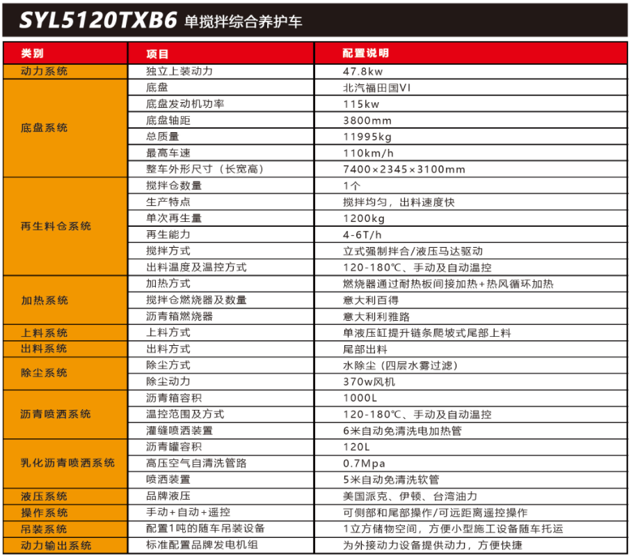 SYL5120TXB6單攪拌綜合養(yǎng)護車是一款集現場生產新瀝青混合料、瀝青路面冷料、舊料、銑刨料100%現場加熱再生利用 ,熱瀝青灑布、裂紋跟蹤灌縫、乳化瀝青噴灑、為其他裝置提供電力和液壓動力等多種功能于一體的瀝青路面熱再生綜合養(yǎng)護車??蓪崿F多場合、多路面的各種類養(yǎng)護作業(yè) ,養(yǎng)護修補費用低 ,作業(yè)快捷 ,高效率、節(jié)能環(huán)保性能突